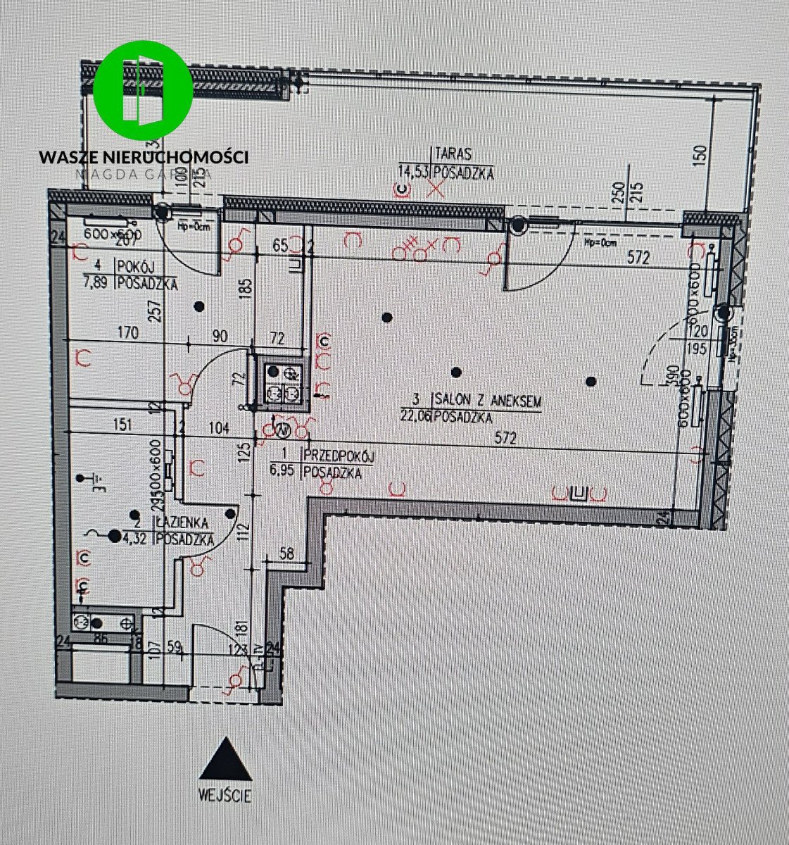 - salon z aneksem kuchennym o pow. 22m² (pełne wyposażenie w sprzęty AGD)